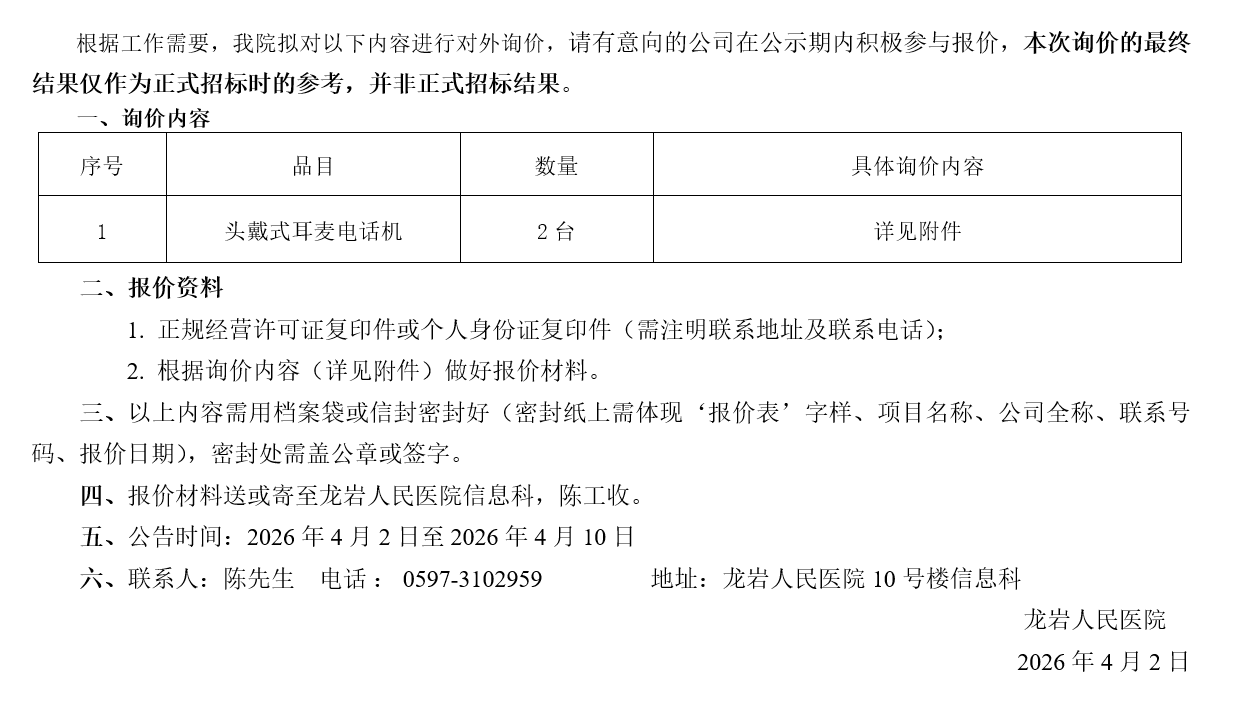 头戴式耳麦电话机询价公告