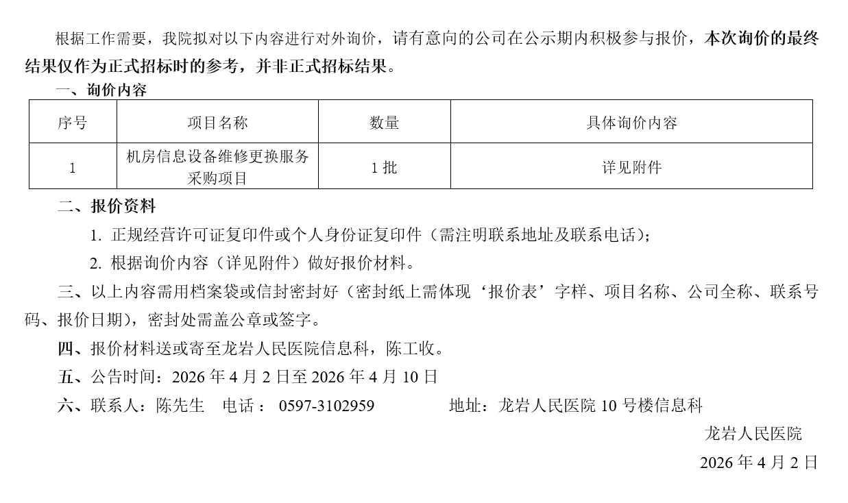 机房信息设备维修更换服务采购项目对外询价公告