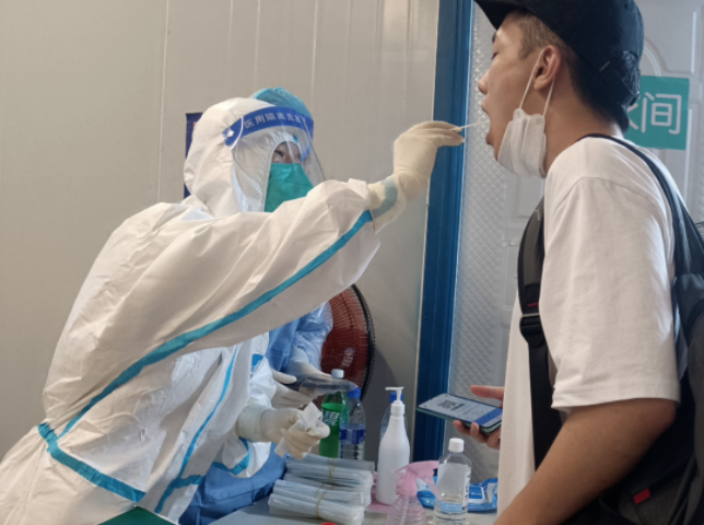 7月以来,35℃以上的高温持续不落,身穿密不透风的防护服比“蒸桑拿”还闷热。因为临时增加核酸采样人员,空调等设备不足,几名护士只能靠电风扇降温,采集核酸的旅客一波接着一波,几名护士先后出现头晕、呕吐等中暑症状,但没有一个人因此离开岗位。
