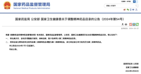 今年4月,国家药监局、公安部、国家卫健委等部门联合发布公告:自2024年7月1日起,将右美沙芬等一批药品纳入第二类精神药品目录。